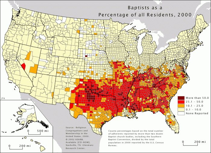 As the above map illustrates almost precisely, the Bible Belt overlaps very nicely onto a map of the American South. Apparent deviations in adherence should be noted along the Texas-Mexico border, south Florida, and an apparent weakening of faith in West Virginia, Virginia, and Maryland. Must be the liberalizing influences of all those atheists living in close proximity of Washington, D.C. The other religion which is finding expression in the light areas in the South is probably Catholicism. Again, geography.