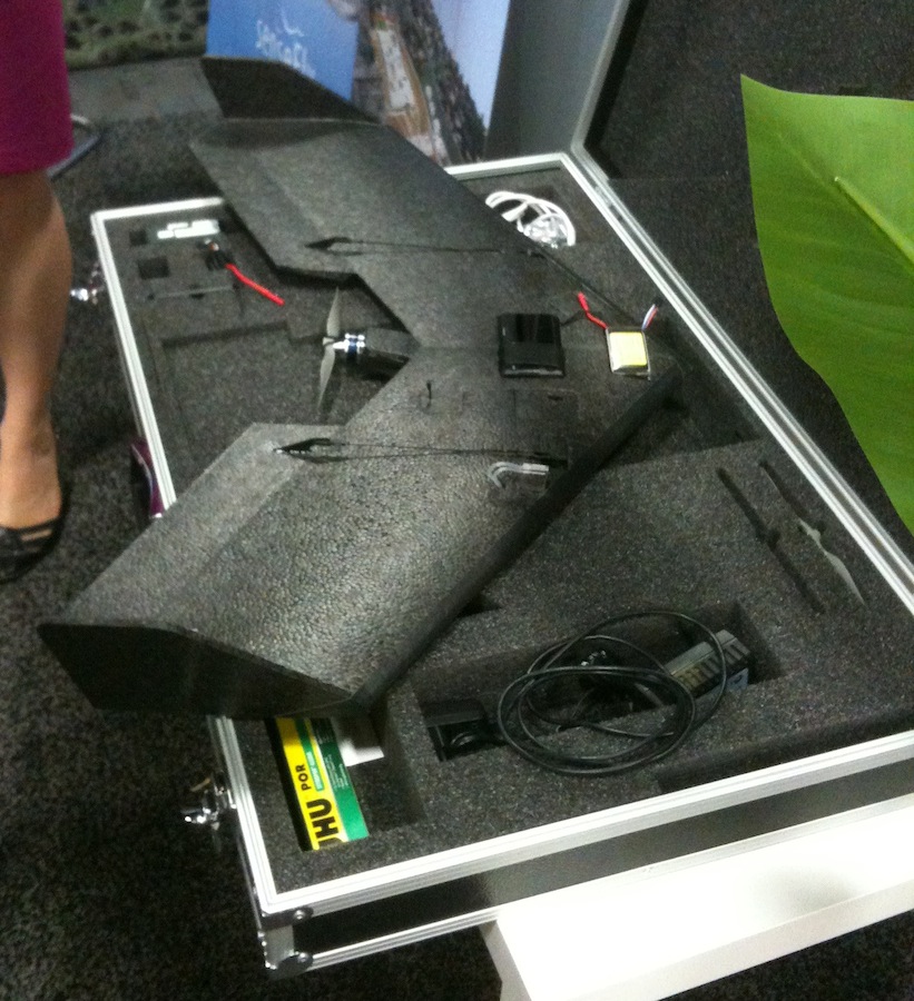 Moving into the literal clouds are new consumer-grade unmanned airborne vehicles (UAV). Three such vehicles were on display. The opening plenary session demonstrated using the GPS-augmented video stream from a UAV to head’s-up digitize building and tanker truck footprints. At a distance of over a mile the video stream provided a means to capture data into a geodatabase in near real-time. The UAV sensor could be switched to thermal, as well, providing the ability to watch a man smoke a cigarette at 6,000ft. Most of these have battery-powered engines which last less than 45 minutes. Some are gasoline-powered and can stay aloft for a couple of hours. And a few are large gliders, which can be launched by hand, guided by remote control. A few DIY people have taken to making their own drones, outfitting them with iPhones or digital cameras, going so far as to “repurpose” a digital camera into a multispectral airborne sensor. Lots of talented people doing cool things these days.