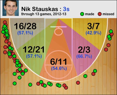 Throughout any given televised games, graphics are displayed which help breakdown success or weaknesses within a particular game. Today, the Internet allows fans to keep track of shot location statistics, turning fans into armchair scouts. Obviously, Nik likes the left-wing side for 3-pt shots, and has remarkable success in the deep corner, one of the most difficult shots in college basketball. If I were a college basketball scout for a Duke opponent, I would make sure whoever guards Nik gets a hand in his face, especially on the left wing.
