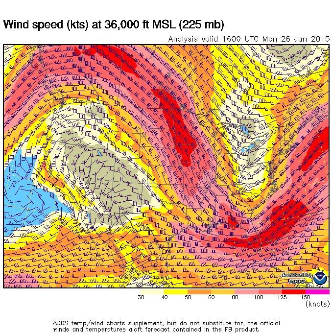 This Rossby wave coincides with our current weather system, aka The Blizzard of 2015. The little black “arrows” are station symbols indicating wind speed and direction. The arrows point in the direction the wind is moving, the “feathers” point in the direction of the wind source region. The number of feathers indicate wind speed. Each line is about 10 knots. Half a mark is 5 knots. A thick triangle is 50 knots. Add up the triangles, plus each full mark, plus any half-mark, and wind speed can be determined.